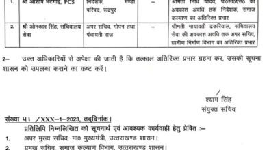 Breaking: Additional responsibility assigned to these two senior officers उत्तराखंड शासन ने इन दो वरिष्ठ अधिकारियों को अतिरिक्त जिम्मेदारी सौंपी…