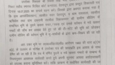 देहरादून : रामदत्त मिश्र, उप निबंधक, स्टम्प एंव रजिस्ट्रेशन विभाग, उत्तराखण्ड के द्वारा सत्यनिष्ठा तथा कर्तव्यपरायणता से अपने कर्तव्यों का…