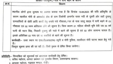 उत्तरकाशी : रविवार रात्रि अतिवृष्टि के कारण तहसील मोरी के आराकोट क्षेत्र के ग्राम टिकोची अन्तर्गत पावर नदी के दूसरी…
