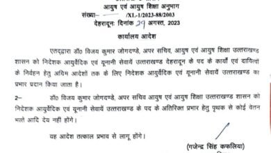 देहरादून। अपर सचिव, आयुष एवं आयुष शिक्षा उत्तराखण्ड शासन डॉ० विजय कुमार जोगदण्डे को अग्रिम आदेशों तक के लिए निदेशक…