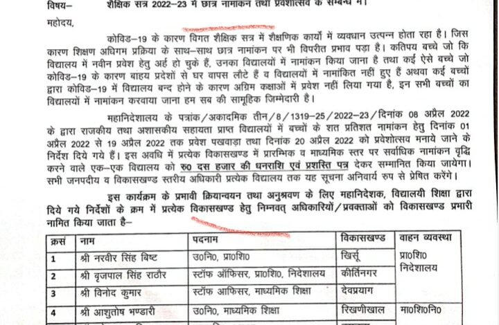 शिक्षा विभाग से बड़ी सामने आ रही है। विभाग ने शैक्षिक सत्र 2022- 2023 में छात्र नामांकन तथा प्रवेशोत्सव के संबंध में 95 अधिकारियों को बड़ी जिम्मेदारी दी है । जिसके आधेश भी जारी कर दिए गए है।