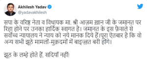 पूर्व सीएम ने ट्वीट कर लिखा कि सपा के वरिष्ठ नेता व विधायक मा. आजम खान जी के जमानत पर रिहा होने पर उनका हार्दिक स्वागत है। जमानत के इस फ़ैसले से सर्वोच्च न्यायालय ने न्याय को नये मानक दिये हैं। पूरा ऐतबार है कि वो अन्य सभी झूठे मामलों-मुक़दमों में बाइज़्ज़त बरी होंगे। झूठ के लम्हे होते हैं, सदियां नहीं!