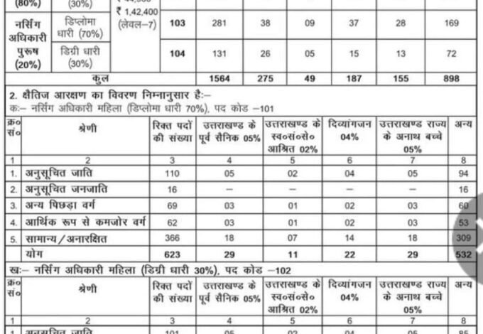 तो वही बोर्ड के सचिव अरविंद सिंह पांगती ने भर्ती की विज्ञप्ति जारी की। कुल 1564 पदों में से 1152 पद महिला अधिकारी के होंगे, जबकि 412 पद पुरुष अधिकारी के होंगे।1152 पदों में 70 प्रतिशत यानी 623 पद डिप्लोमा धारियों के लिए और 30 प्रतिशत यानी 529 पद डिग्री धारकों के लिए होंगे।