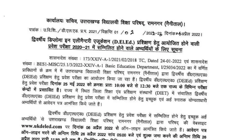 उत्तराखंड विद्यालय शिक्षा परिषद रामनगर ने डीएलएड के फार्म आमंत्रित किए हैं डीएलएड करने वालों को ऑनलाइन आवेदन करना होगा दिवसीय डीएलएड प्रशिक्षण हेतु प्रवेश परीक्षा में सम्मिलित होने हेतु इच्छुक अभ्यर्थियों से उत्तराखंड विद्यालय शिक्षा परिषद रामनगर द्वारा परिषद की वेबसाइट www.ukdeled.com पर दिनांक 6 अप्रैल 2022 से ऑनलाइन आमंत्रित किए आवेदन पत्र ऑनलाइन भरने की अंतिम तिथि 26 अप्रैल 2022 साईं 5:00 बजे तक रखी गई है।