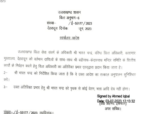 सोमवार को अपर सचिव वित्त डॉ अहमद इकबाल द्वारा जारी आदेश में प्रदेश वित्त सेवा के अधिकारी और कारागार मुख्यालय में तैनात वरिष्ठ वित्त अधिकारी भारत चंद्र को बीकेटीसी में वित्त अधिकारी का अतिरिक्त प्रभार सौंपा गया है।