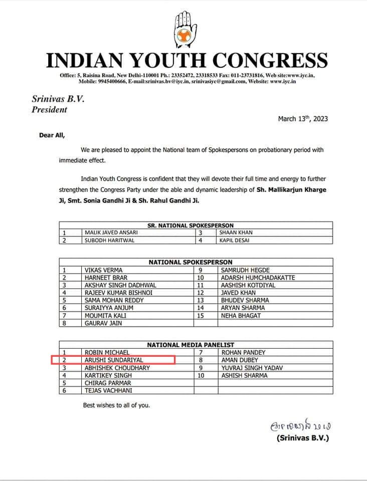 आरुषि सुंद्रियाल बनी भारतीय युवा कांग्रेस में उत्तराखंड की पहली राष्ट्रीय मीडिया पैनलिस्ट