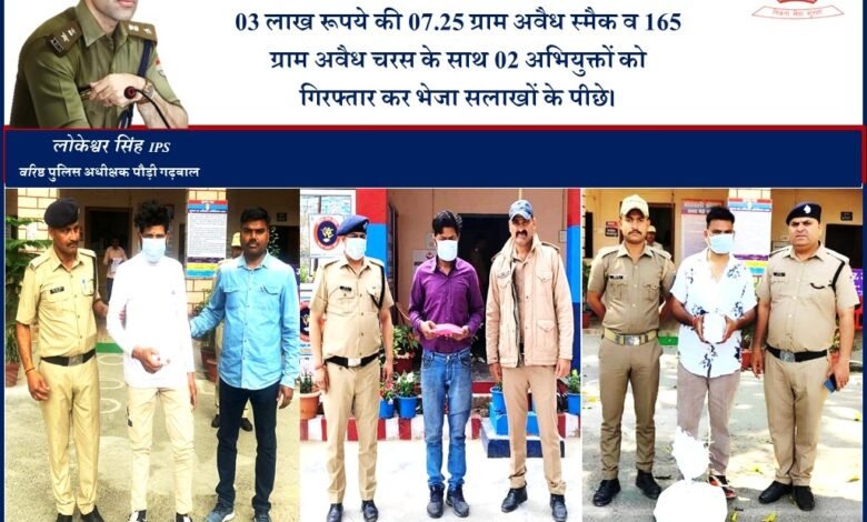 03 लाख रूपये की 07.25 ग्राम अवैध स्मैक व 165 ग्राम अवैध चरस के साथ 02 अभियुक्तों को गिरफ्तार कर भेजा सलाखों के पीछे।