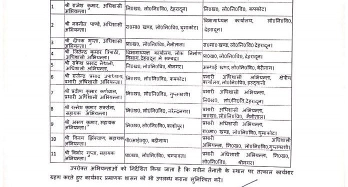 उत्तराखंड शासन ने लोक निर्माण विभाग के अभियंताओं के कार्यक्षेत्र में फेरबदल किया है। पढ़े किसको भेजा कहां।