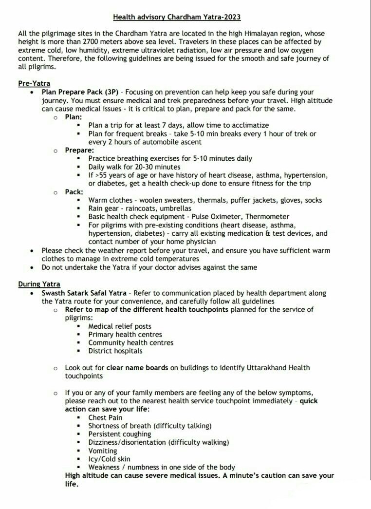 शासन की ओर से जारी दिशा निर्देश में कहा गया है कि समस्त तीर्थ स्थल उच्च हिमालयी क्षेत्र में स्थित हैं, जिनकी ऊंचाई समुद्र तल से 2700 मी० से भी अधिक है। उन स्थानों में यात्रीगण अत्यधिक ठण्ड, कम आर्द्रता, अत्यधिक अल्ट्रा वॉइलेट रेडिएशन, कम हवा का दबाव और कम ऑक्सीजन की मात्रा से प्रभावित हो सकते हैं। अतः सभी तीर्थ यात्रियों के सुगम एवं सुरक्षित यात्रा हेतु दिशा निर्देश (Health Advisory) का पालन करना चाहिए।