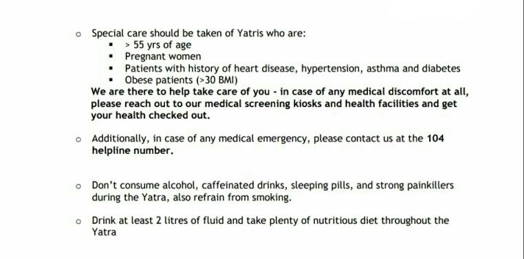 सभी तीर्थ यात्रियों के सुगम एवं सुरक्षित यात्रा हेतु स्वास्थ्य सम्बन्धित दिशा निर्देश पत्र के साथ संलग्न कर इस आशय के साथ प्रेषित किये जा रहे हैं कि यात्रा से पूर्व तथा यात्रा के दौरान बरती जाने वाली सावधानियों का यात्रियों के मध्य वृहद रूप से प्रचार-प्रसार किया जा सके।