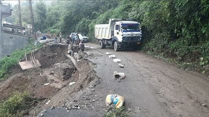 बारिश के बाद दो जगह से धंसा कैंपटी के पास NH का बड़ा हिस्सा, सड़क पर आईं दरारें