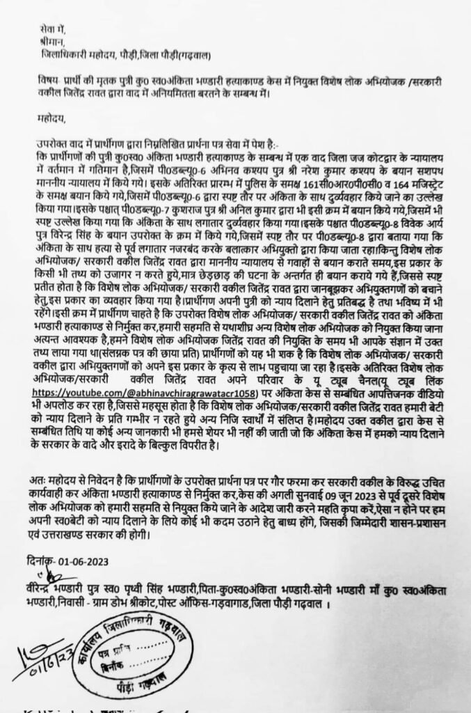 अतः महोदय से निवेदन है कि प्रार्थीगणों के उपरोक्त प्रार्थना पत्र पर गौर फरमा कर सरकारी वकील के विरुद्ध उचित कार्यवाही कर अंकिता भण्डारी हत्याकाण्ड से निर्मुक्त कर, केस की अगली सुनवाई 09 जून 2023 से पूर्व दूसरे विशेष लोक अभियोजक को हमारी सहमति से नियुक्त किये जाने के आदेश जारी करने महति कृपा करें, ऐसा न होने पर हम अपनी स्व0 बेटी को न्याय दिलाने के लिये कोई भी कदम उठाने हेतु बाध्य होंगे, जिसकी जिम्मेदारी शासन-प्रशासन एवं उत्तराखण्ड सरकार की होगी।