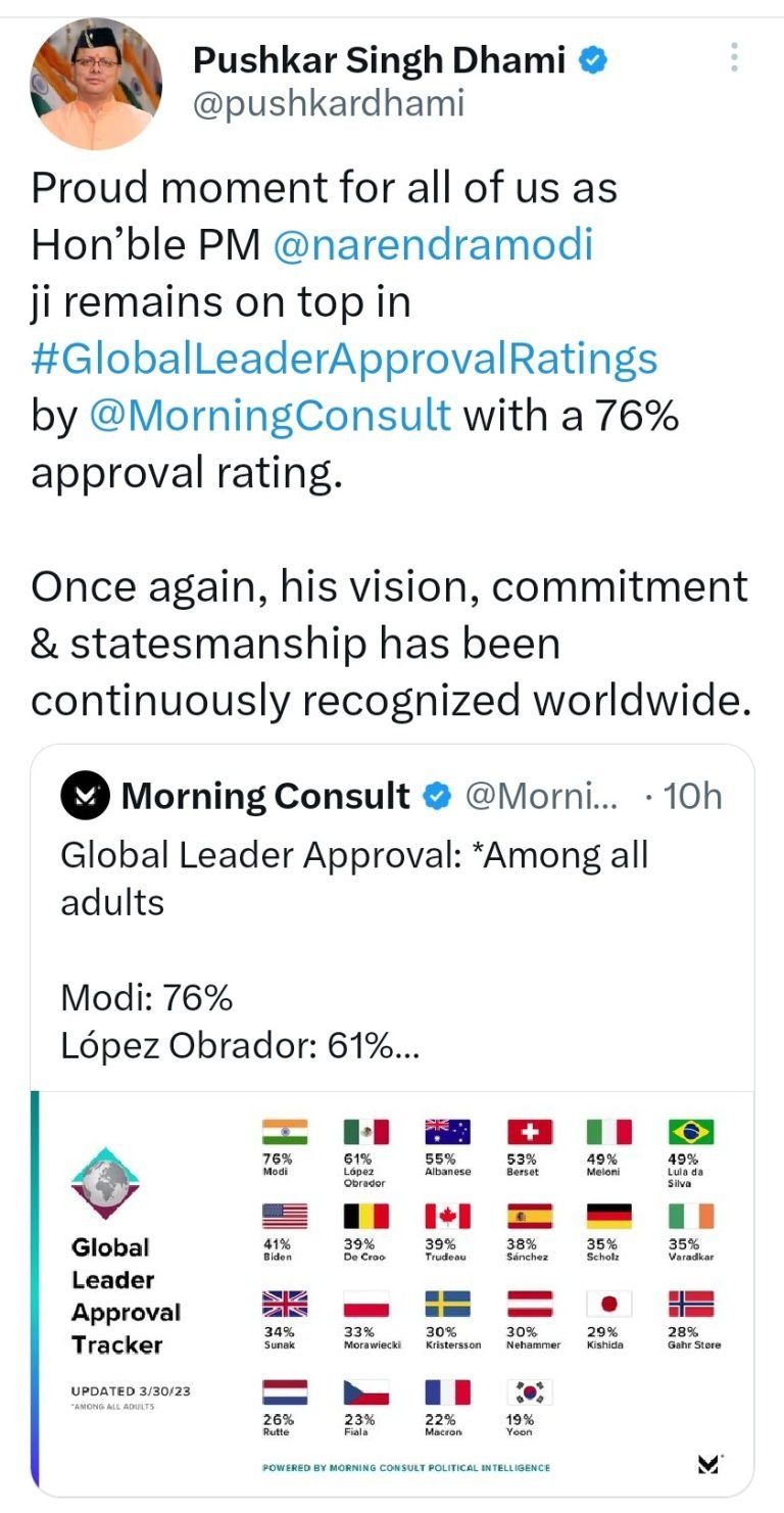 मुख्यमंत्री धामी ने कहा कि मॉर्निंग कंसल्ट की ओर से जारी विश्व नेताओं की यह 76 प्रतिशत अप्रूवल रेटिंग दर्शाती है कि प्रधानमंत्री मोदीजी की लोकप्रियता भारत ही नहीं बल्कि दुनिया भर में उनके प्रशंसक और चाहने वाले हैं।