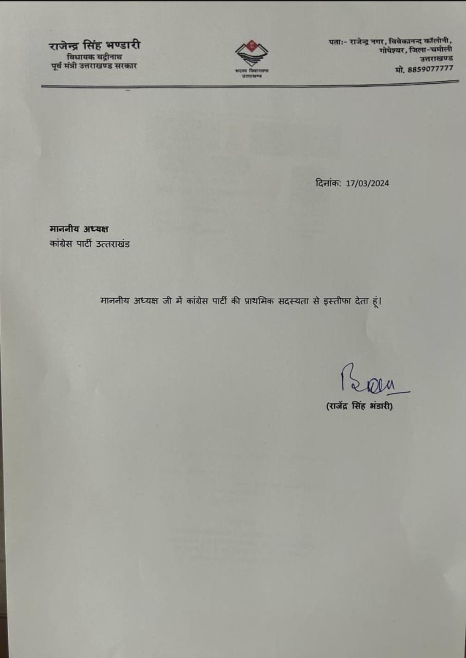 लोकसभा चुनाव की दहलीज पर कांग्रेस को एक और बड़ा झटका लगा है गढ़वाल के सबसे बड़े ठाकुर नेता जिन्हें शेर ए गढ़वाल भी कहा जाता है, राजेंद्र भंडारी जो बद्रीनाथ से सीटिंग विधायक हैं, और उनकी पत्नी जिला पंचायत चमोली अध्यक्ष है, उन्होंने कांग्रेस को अलविदा कह दिया है। यह कांग्रेस के लिए बहुत बड़ा झटका माना जा रहा है। यह अनिल बलूनी की सूझबूझ का ही नतीजा माना जा रहा है, उनके भाजपा में शामिल होने के बाद अब अनिल बलूनी की मुश्किलें कम हो गई हैं,