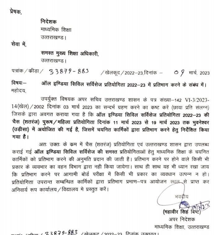 अतः उक्तः के क्रम में चैस (शतरंज) प्रतियोगिता एवं उत्तराखण्ड शासन द्वारा उपलब्ध कराई गई ऑल इण्डिया सिविल सर्विसेज की समस्त प्रतियोगिताओं हेतु माध्यमिक शिक्षा के चयनित कार्मिकों को प्रतिभाग करने की अनुमति प्रदान की जाती है। प्रतिभाग करने पर होने वाले किसी भी प्रकार के व्ययभार का वहन विभाग द्वारा नही किया जायेगा। साथ ही साथ यह भी ध्यान रखा जाय कि प्रतिभाग करने पर आगामी बोर्ड परीक्षा में किसी भी प्रकार का व्यवधान उत्पन्न न हो। प्रतियोगिता उपरान्त सम्बन्धित कार्मिकों द्वारा प्रतिभाग प्रमाण-पत्र आयोजन स्थल से प्राप्त कर अनिवार्य रूप कार्यालय / विद्यालय मे प्रस्तुत करें।