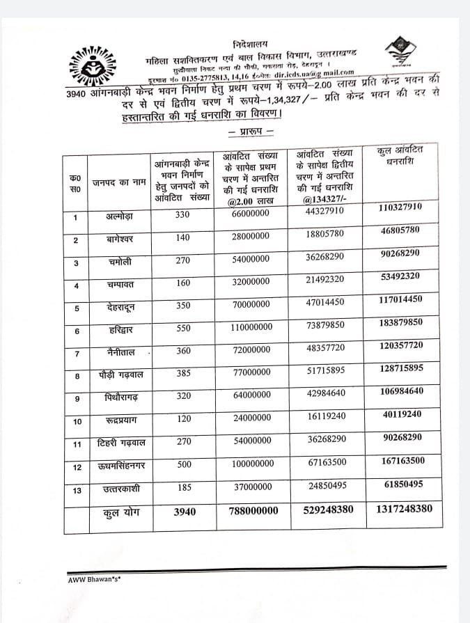 विभागीय मंत्री ने कहा कि जल्द ही इन भवनों के निर्माण का काम शुरू कर दिया जाएगा।कहा कि इससे हमारे आंगनबाड़ी केंद्र और अधिक सुदृढ होंगे ।साथ ही पहाड़ी जनपदों के लिए यह एक बड़ी सौगात है।वहां पर हमारे नोनिहालो को काफी सहूलियत मिलेगी।बताया कि प्रथम चरण में प्रति भवन के निर्माण हेतु कुल 2 लाख व दूसरे चरण में कुल 1 लाख 34 हजार 327 प्रति भवन के निर्माण हेतु धनराशि स्वीकृत की गई है।