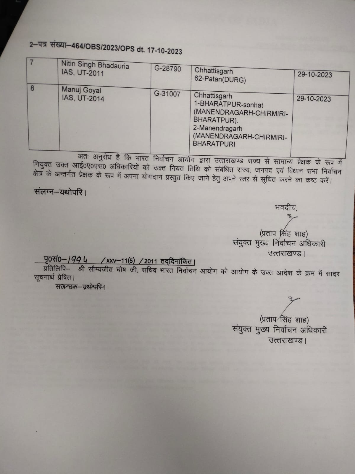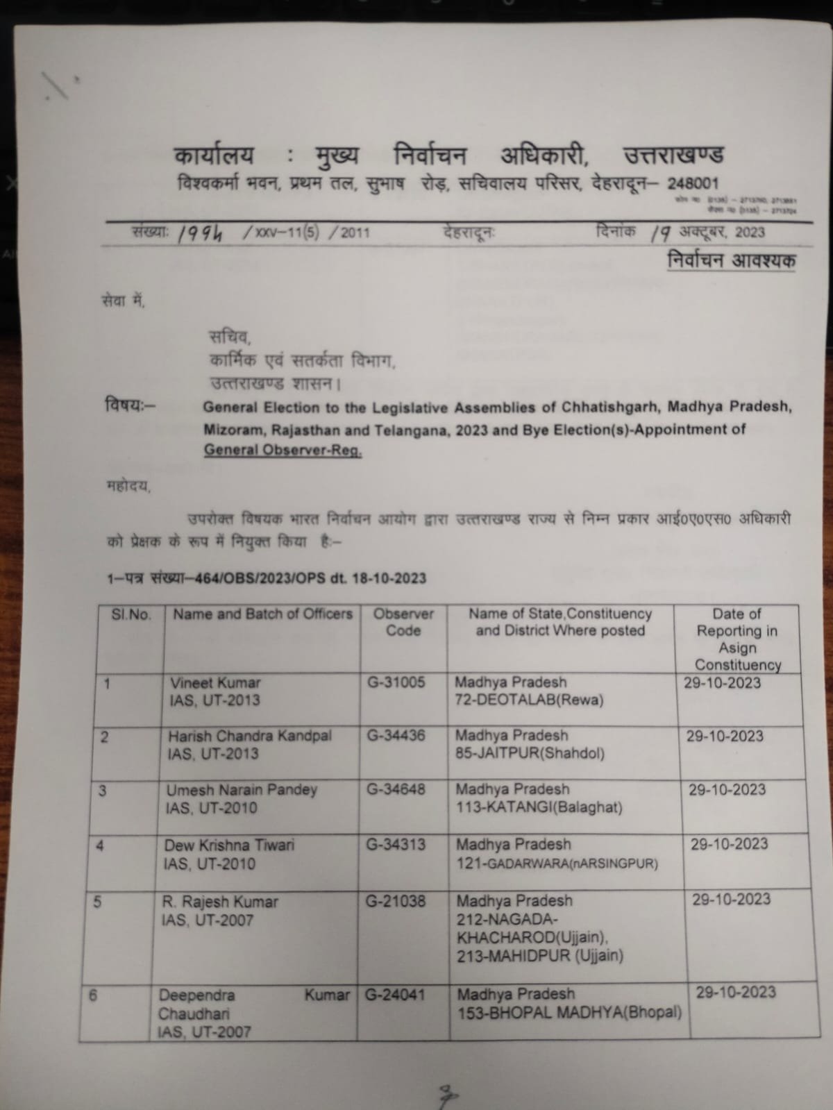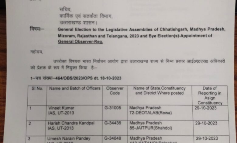 आर. राजेश कुमार, देव कृष्ण तिवारी, विनीत कुमार, दीपेंद्र चौधरी, उमेश नारायण पांडे, हरीश चंद्र कांडपाल मध्यप्रदेश विधानसभा चुनाव के लिए ऑब्जर्वर नियुक्त