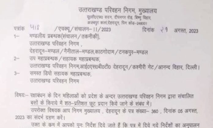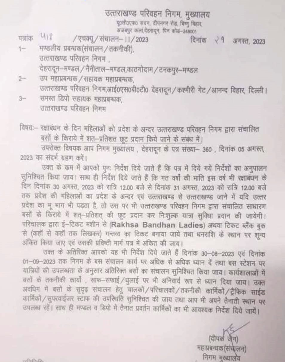 देहरादून। रक्षाबंधन के दिन महिलाओं को प्रदेश के अन्दर उत्तराखण्ड परिवहन निगम की बसों के किराये में शत-प्रतिशत छूट प्रदान की जाएगी। रक्षाबंधन के दिन 30 अगस्त, 2023 को रात्रि 12.00 बजे से 31 अगस्त, 2023 को रात्रि 12.00 बजे तक प्रदेश की महिलाओं का प्रदेश के अन्दर एवं उत्तराखण्ड से उत्तराखण्ड जाने में यदि उत्तर प्रदेश का भू भाग भी पड़ता है, तो उस पर भी उत्तराखण्ड परिवहन निगम द्वारा संचालित साधारण बसों के किराये में शत-प्रतिशत की छूट प्रदान कर निःशुल्क यात्रा सुविधा प्रदान की जायेगी।