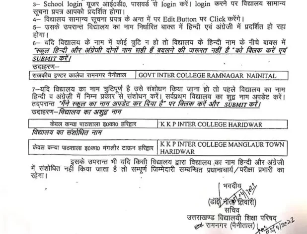ध्यान रहे कि सम्बन्धित बाक्स में विद्यालय का नाम वह अंकित किया जाय जो कि अंक विवरणिका एवं प्रमाणपत्र सह अंक पत्र पर मुद्रित होना है। विद्यालय का नाम संशोधन हेतु निम्न प्रक्रिया अपनाई जायेगी।
