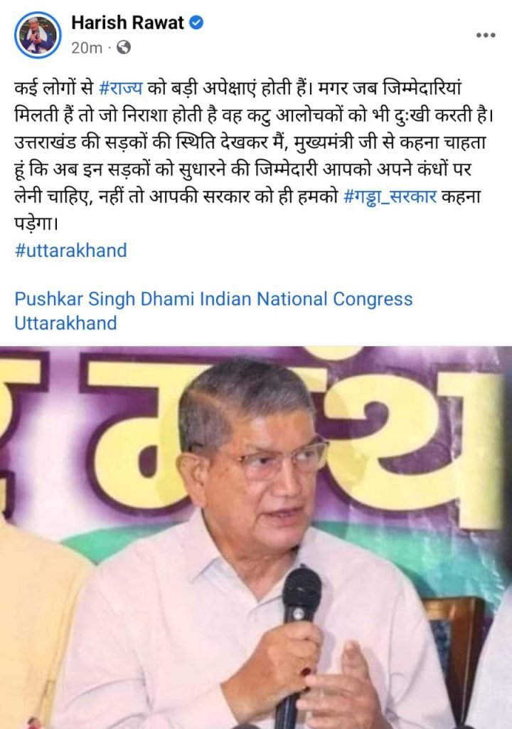 मुख्यमंत्री धामी जल्द इस जिम्मेदारी को ले वरना आपकी सरकार को गड्ढा सरकार कहना पड़ेगा- हरीश रावत