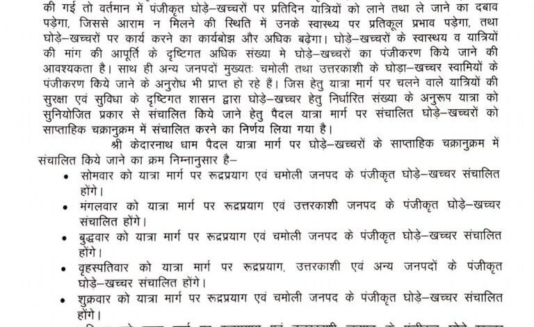 साप्ताहिक चक्रानुक्रम में संचालित करने का निर्णय लिया गया है। श्री केदारनाथ धाम पैदल यात्रा मार्ग पर घोड़े – खच्चरों के साप्ताहिक चक्रानुक्रम में संचालित किये जाने का क्रम निम्नानुसार है-