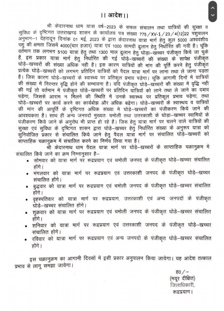 वृहस्पतिवार को यात्रा मार्ग पर रूद्रप्रयाग, उत्तरकाशी एवं अन्य जनपदों के पंजीकृत घोड़े – खच्चर संचालित होंगे।
