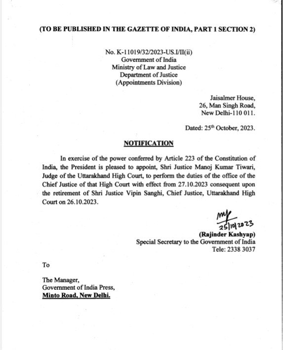 बड़ी खबर : न्यायामूर्ती मनोज कुमार तिवारी होंगें कार्यवाहक मुख्य न्यायाधीश
