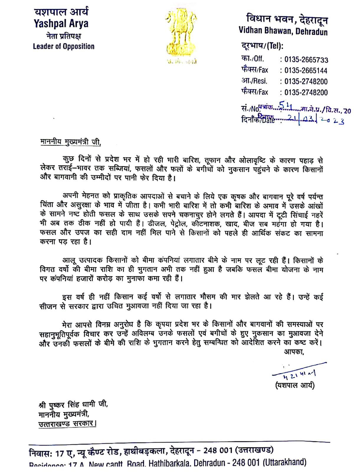 बड़ी ख़बर” नेता प्रतिपक्ष यशपाल आर्य ने मुख्यमंत्री को लिखा पत्र
