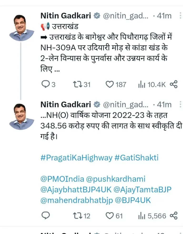 उत्तराखंड के बागेश्वर और पिथौरागढ़ जिले में एनएच 309a पर टूलेन के पुनर्वास और उन्नयन कार्य के लिए वार्षिक योजना 2022 23 के तहत 348.56 करोड रुपए की लागत की स्वीकृति दी गई है केंद्रीय भूतल एवं परिवहन मंत्री नितिन गडकरी ने ट्वीट कर या जानकारी दी है.