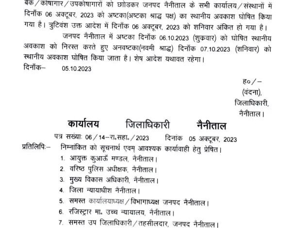 Uttarakhand : जनपद नैनीताल के सभी कार्यालय की छुट्टी का संशोधित आदेश जारी किया गया है सभी सरकारी कार्यालय संस्थानों में 6 अक्टूबर 2023 को अष्टका का श्राद्ध पक्ष का स्थानीय अवकाश घोषित किया गया है त्रुटिबस उक्त आदेश में 6 अक्टूबर 2023 को शनिवार अंकित हो गया है जनपद नैनीताल में आस्तिक 6 अक्टूबर शुक्रवार को स्थानीय घोषित अवकाश को निरस्त करते हुए अनवष्टका नवमी श्राद्ध 7 अक्टूबर शनिवार को स्थानीय अवकाश घोषित किया जाता है शेष आदेश यथावत रहेंगे जिला अधिकारी ने संशोधित आदेश शनिवार का जारी किया है।