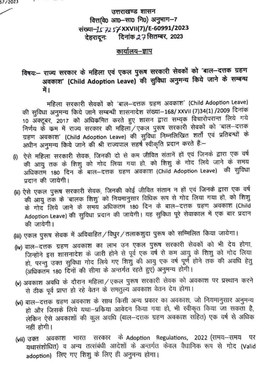देहरादून : राज्य सरकार के विभिन्न विभागों में कार्यरत महिला एवं एकल पुरुष कर्मचारियों को बाल- दत्तक ग्रहण अवकाश (Child Adoption Leave ) की सुविधा मिलेगी। वित्त विभाग ने मंगलवार को इसका आदेश जारी कर दिया है। देखें मूल आदेश उत्तराखण्ड शासन वित्त (वे० आ० – सा० नि०) अनुभाग-7 संख्या – 157257 XXVII (7) /E-60991/2023 देहरादून: दिनांक 27 सितम्बर, 2023 कार्यालय-ज्ञाप विषय:- राज्य सरकार के महिला एवं एकल पुरुष सरकारी सेवकों को ‘बाल- दत्तक ग्रहण अवकाश’ (Child Adoption Leave ) की सुविधा अनुमन्य किये जाने के सम्बन्ध में। महिला सरकारी सेवकों को ‘बाल- दत्तक ग्रहण अवकाश’ (Child Adoption Leave ) की सुविधा अनुमन्य किये जाने सम्बन्धी शासनादेश संख्या-168/XXVII (7)34(1)/2009 दिनांक 10 अक्टूबर, 2017 को अधिक्रमित करते हुए शासन द्वारा सम्यक विचारोपरान्त लिये गये निर्णय के क्रम में राज्य सरकार की महिला / एकल पुरुष सरकारी सेवकों को ‘बाल- दत्तक ग्रहण अवकाश’ (Child Adoption Leave) की सुविधा निम्नलिखित शर्तों एवं प्रतिबन्धों के अधीन अनुमन्य किये जाने की श्री राज्यपाल सहर्ष स्वीकृति प्रदान करते हैं:- (i) ऐसे महिला सरकारी सेवक जिनकी दो से कम जीवित संतानें हों एवं जिनके द्वारा एक वर्ष की आयु तक के शिशु को गोद लिया गया हो, को शिशु के गोद लिये जाने के समय अधिकतम 180 दिन के बाल दत्तक ग्रहण अवकाश (Child Adoption Leave ) की सुविधा प्रदान की जायेगी। (ii) ऐसे एकल पुरूष सरकारी सेवक, जिनकी कोई जीवित संतान न हों एवं जिनके द्वारा एक वर्ष की आयु तक के ‘बालक शिशु को नियमानुसार विधिक रूप से गोद लिया गया हो, को शिशु के गोद लिये जाने के समय अधिकतम 180 दिन के बाल- दत्तक ग्रहण अवकाश (Child Adoption Leave) की सुविधा प्रदान की जायेगी। यह सुविधा पूरे सेवाकाल में एक बार प्रदान की जायेगी। (ii) एकल पुरूष सेवक में अविवाहित / विधुर / तलाकशुदा पुरुष को सम्मिलित किया जायेगा। (iv) बाल- दत्तक ग्रहण अवकाश का लाभ उन एकल पुरूष सरकारी सेवकों को भी देय होगा. जिन्होंने इस शासनादेश के जारी होने से पूर्व एक वर्ष से कम आयु के शिशु को गोद लिया हो, परन्तु उक्त सुविधा गोद लिये गए शिशु की आयु एक वर्ष पूर्ण होने तक की अवधि हेतु (अधिकतम 180 दिनों की सीमा के अन्तर्गत रहते हुए) अनुमन्य होगी। (v) अवकाश अवधि के दौरान महिला / एकल पुरुष सरकारी सेवक को अवकाश पर प्रस्थान करने से ठीक पूर्व प्राप्त हो रहे वेतन के समतुल्य अवकाश वेतन देय होगा । (vi) बाल- दत्तक ग्रहण अवकाश के साथ किसी अन्य प्रकार का अवकाश, जो नियमानुसार अनुमन्य हो और जिसके लिये यथा-प्रकिया आवेदन किया गया हो, भी स्वीकृत किया जा सकता है, लेकिन ऐसे अवकाशों की कुल अवधि (बाल- दत्तक ग्रहण अवकाश सहित) एक वर्ष से अधिक नहीं होगी। (vii) उक्त अवकाश भारत सरकार के Adoption Regulations, 2022 ( समय-समय पर यथासंशोधित) व अन्य तत्संबंधी आदेशों के अन्तर्गत केवल वैधानिक रूप से गोद (Valid adoption) लिए गए श