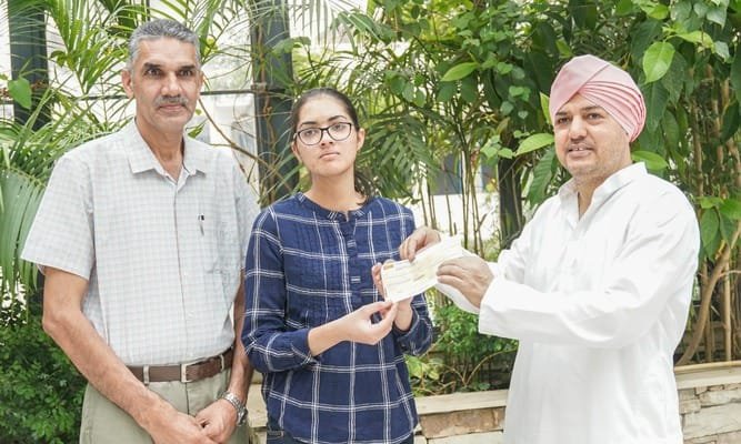 श्री गुरु राम राय यूनिवर्सिटी की ओर से श्री महाराज जी ने शगुन को 25000 रुपए का चेक प्रोत्साहन स्वरुप प्रदान किया