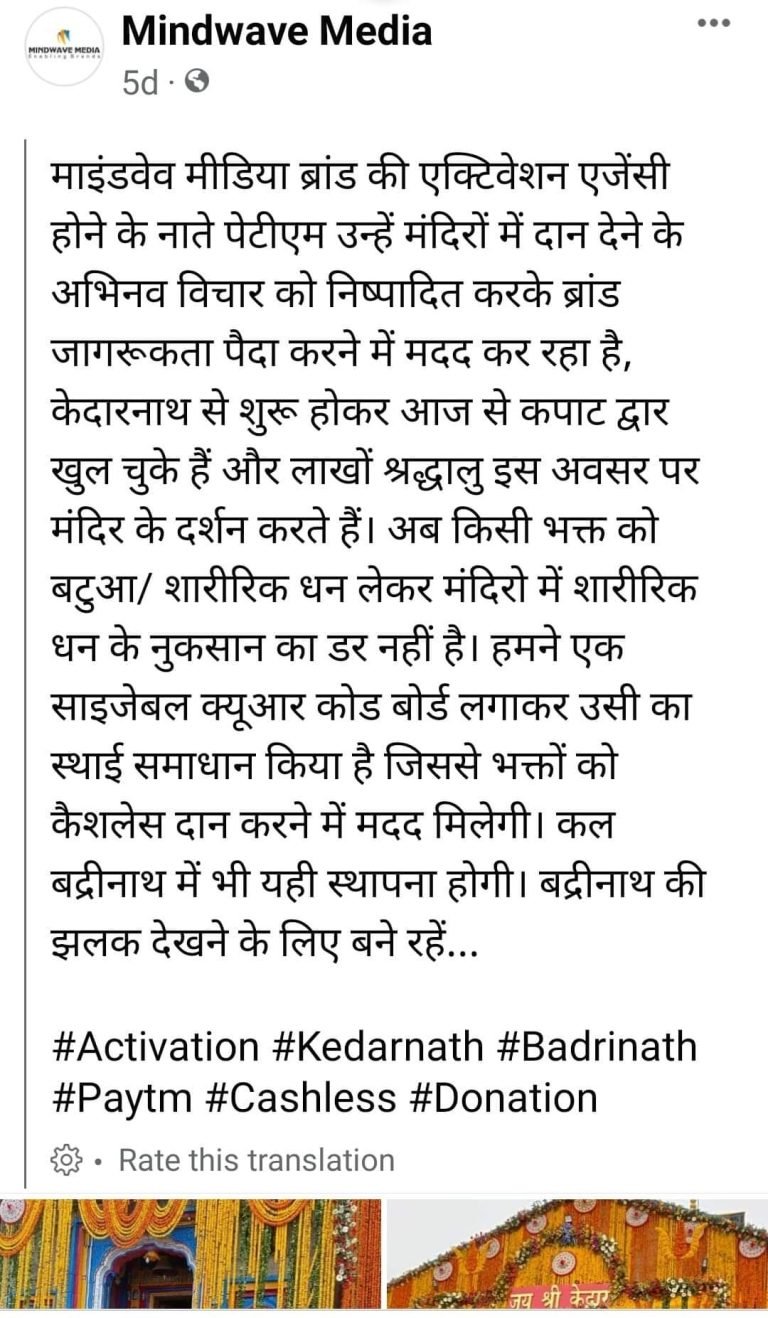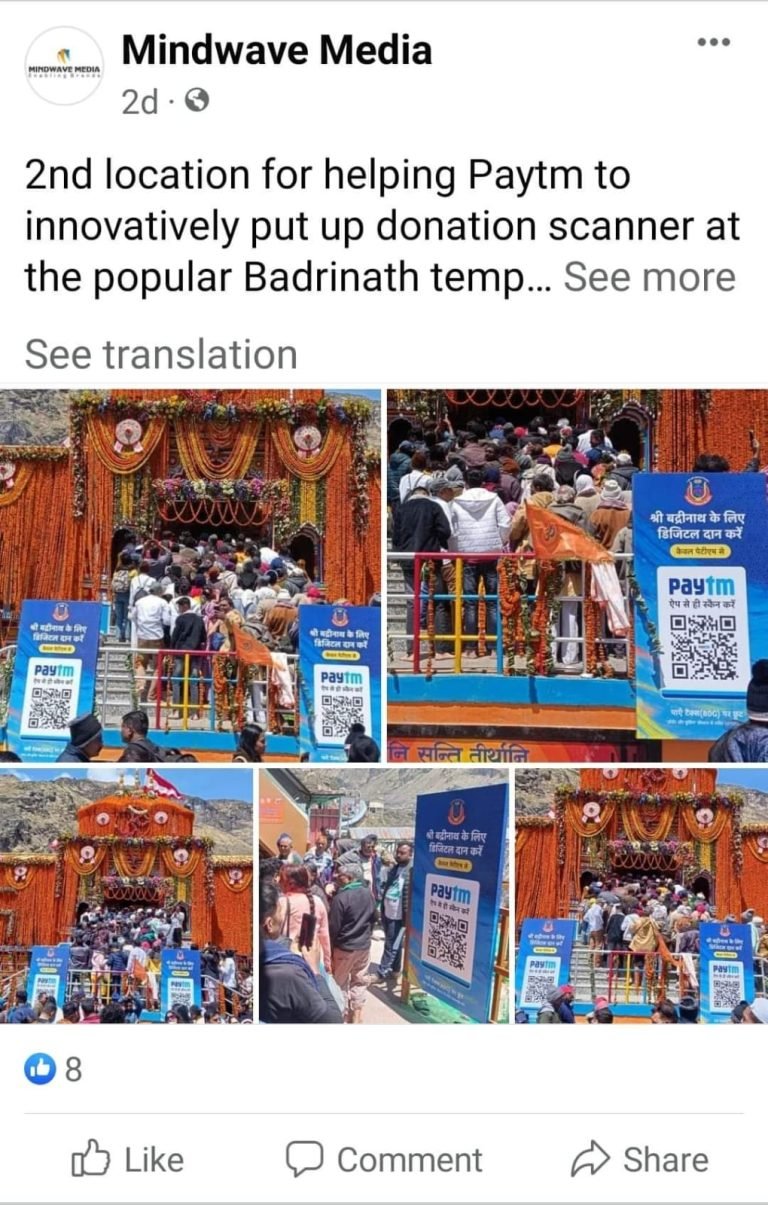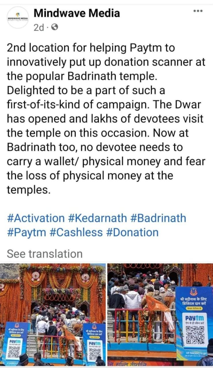 वहीं दूसरी ओर MINDWAVE MEDIA नाम के एक एडवरटाइजिंग एजेंसी ने अपने फेसबुक पेज में दावा किया गया है कि उसने ही केदारनाथ और बदरीनाथ धाम में क्यूआर कोड के साइन बोर्ड लगाकर श्रृद्धालुओं को डिजिटल दान देने की सुविधा मुहैया करवाई है।