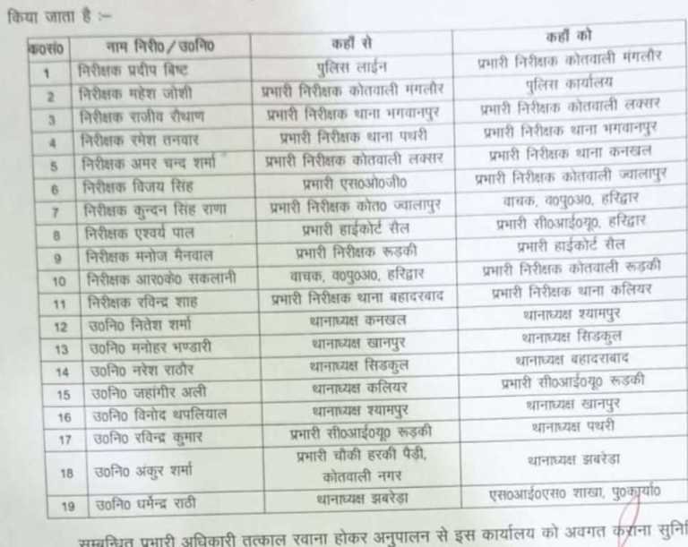 बहादराबाद इंस्पेक्टर रविंद्र शाह को कलियर इंस्पेक्टर, कनखल थानाध्यक्ष नितेश शर्मा को थानाध्यक्ष श्यामपुर, खानपुर थानाध्यक्ष मनोहर भंडारी को सिडकुल थानाध्यक्ष, नरेश राठौर को यहां से बहादराबाद थानाध्यक्ष, कलियर से जहांगीर अली को प्रभारी सीआईयू रुड़की,श्यामपुर थाना अध्यक्ष विनोद थपलियाल को थानाध्यक्ष खानपुर, रुड़की सीआईयू प्रभारी रविंद्र कुमार को थानाध्यक्ष पथरी, हर की पैड़ी चौकी प्रभारी अंकुर शर्मा को थाना अध्यक्ष झगड़ा और यहां से धर्मेंद्र राठी को एसआईएस शाखा रवाना किया गया।