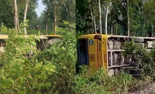 प्राप्त जानकारी के अनुसार स्कूल की बस लालकुआं से बच्चे लेकर आज प्रातः 7 बजे हल्द्वानी की ओर को जा रही थी कि जैसे ही बस डिपो संख्या चार के सामने पहुंची तभी अनियंत्रित होकर सड़क से नीचे उतरकर खाई में पलट गई, बस में चार बच्चे, स्कूल स्टाफ, आया और ड्राइवर सवार थे। बच्चों एवं अन्य को हल्की-फुल्की खरोचों के अलावा कोई चोट नहीं आई, मौके पर पहुंचे भाजपा मंडल अध्यक्ष धन सिंह बिष्ट समेत 112 पुलिस ने शीशे तोड़कर सभी को बाहर निकाला, तथा बच्चों को सुरक्षित घर ले जाया गया.