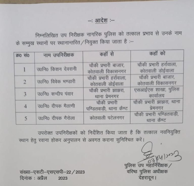 देहरादून जनपद में 5 सब इंस्पेक्टरों के तबादले किए गए हैं, इस संबंध में एसएसपी दलीप सिंह कुंवर ने स्थानांतरण आदेश जारी किया है। स्थानांतरण आदेश में 5 उप निरीक्षक नागरिक पुलिस को इधर से उधर किया गया है, साथ ही कई चौकी प्रभारी भी बदले गए हैं।
