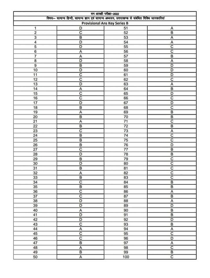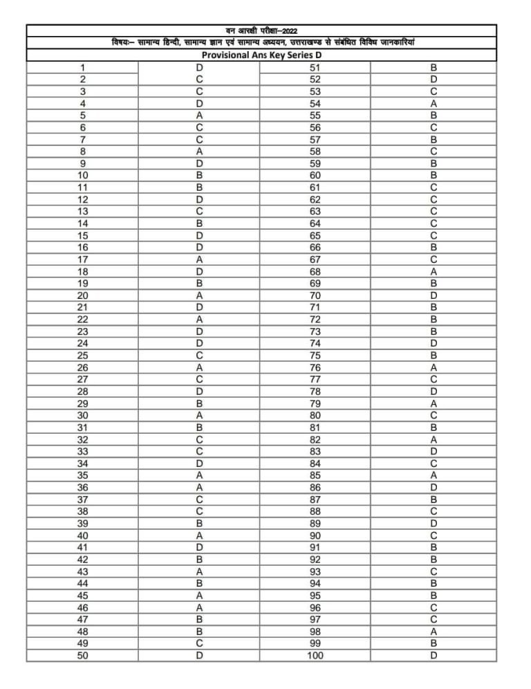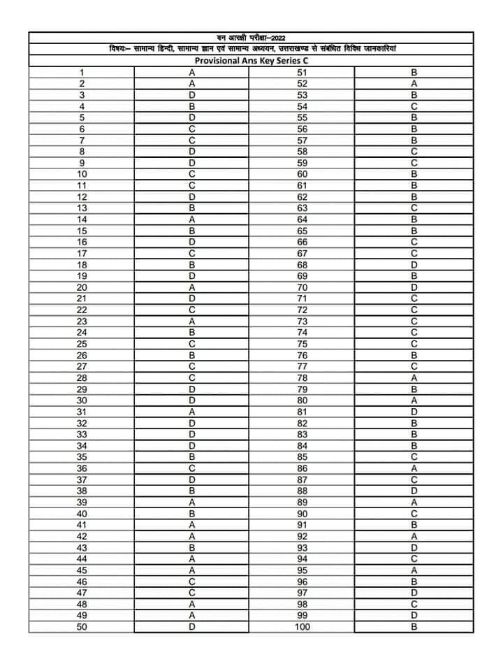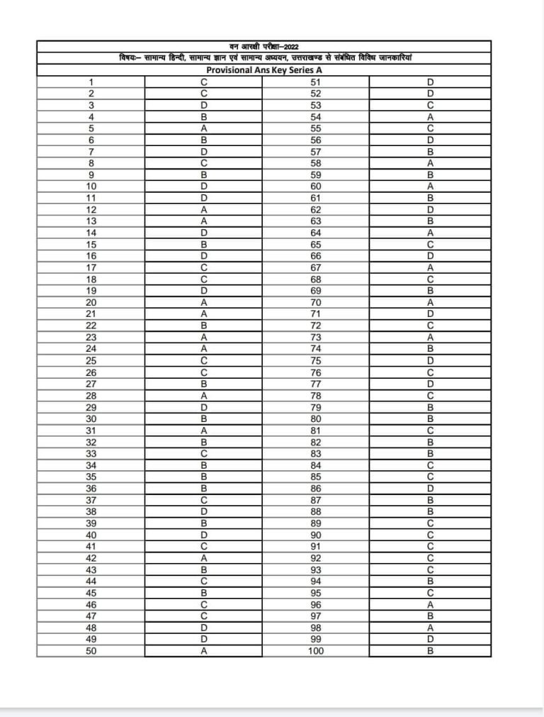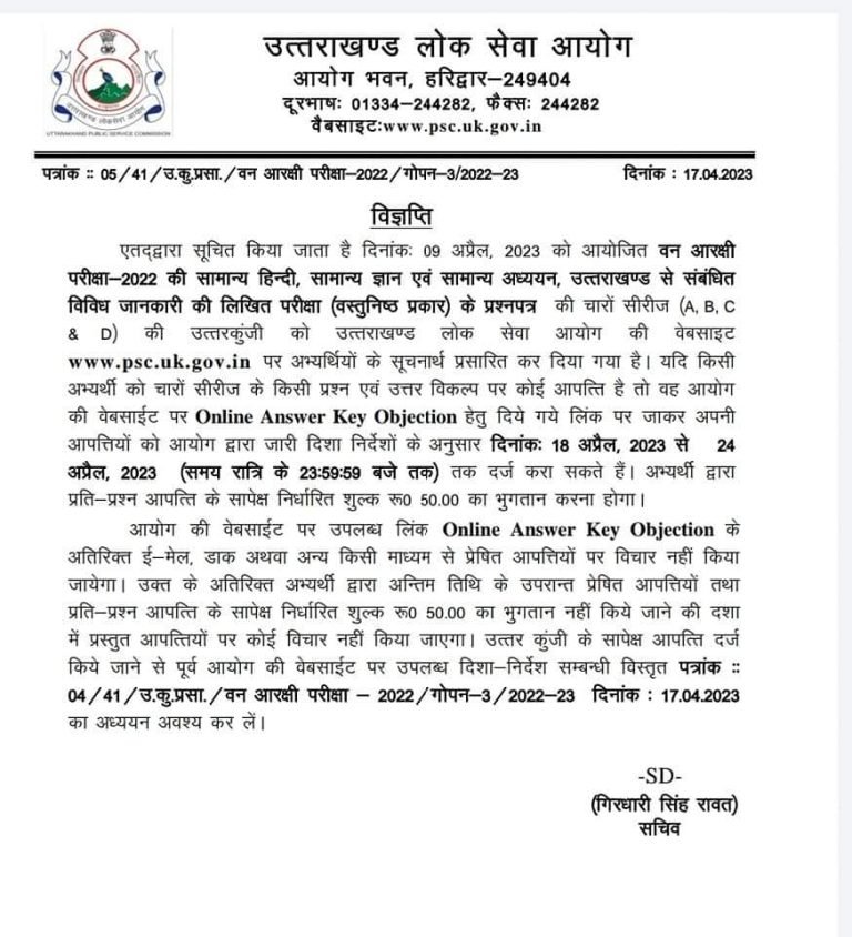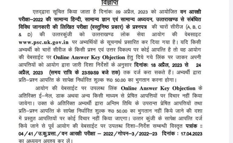 एतद्द्वारा सूचित किया जाता है दिनांकः 09 अप्रैल, 2023 को आयोजित वन आरक्षी परीक्षा – 2022 की सामान्य हिन्दी, सामान्य ज्ञान एवं सामान्य अध्ययन, उत्तराखण्ड से संबंधित विविध जानकारी की लिखित परीक्षा ( वस्तुनिष्ठ प्रकार ) के प्रश्नपत्र की चारों सीरीज (A, B, C & D) की उत्तरकुंजी को उत्तराखण्ड लोक सेवा आयोग की वेबसाइट www.psc.uk.gov.in पर अभ्यर्थियों के सूचनार्थ प्रसारित कर दिया गया है।