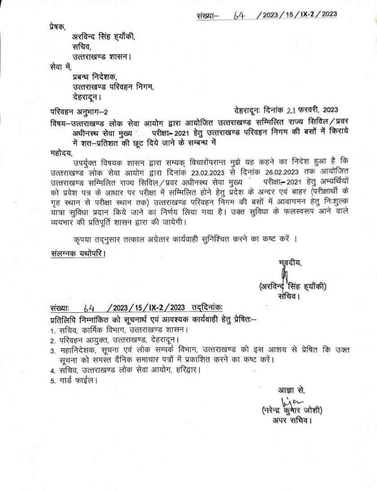 मुख्यमंत्री पुष्कर सिंह धामी के निर्देश पर उत्तराखण्ड लोक सेवा आयोग द्वारा 23 फरवरी से 26 फरवरी 2023 को आयोजित की जाने वाली सम्मिलित राज्य सिविल/प्रवर अधीनस्थ सेवा मुख्य परीक्षा हेतु अभ्यर्थियों को उत्तराखण्ड परिवहन निगम की बसों में किराये में शत-प्रतिशत छूट दी जाएगी।