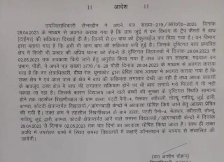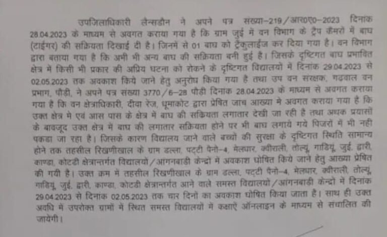 जिला अधिकारी ने जारी अपने आदेश में कहा कि तहसील रिखणीखाल के ग्राम डल्ला पट्टी. पैनो 4. मेलधार. क्वीराली. तोल्यू. गाड़ियू. जूही. द्वारी. कांडा कोटडी. क्षेत्र अंतर्गत आने वाले समस्त विद्यालय आंगनवाड़ी केंद्रों में दिनांक 29-04 से दो मई तक 4 दिनों का अवकाश घोषित किया गया है।