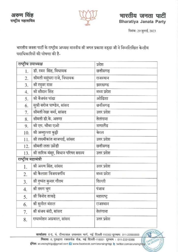 देहरादून : लोकसभा चुनाव से पहले भारतीय जनता पार्टी राष्ट्रीय कार्यकारिणी में बड़ा फेरबदल कर संगठन को और अधिक मजबूत करने के लिए देश से इन लोगों को मौका दिया गया है। भारतीय जनता पार्टी के राष्ट्रीय अध्यक्ष जगत प्रकाश नड्डा के द्वारा जारी पत्र के साथ इन लोगों को नई जिम्मेदारियां सौंपी गई है उत्तराखंड से भारतीय जनता पार्टी के राज्यसभा सांसद नरेश बंसल राष्ट्रीय सह कोषाध्यक्ष बनाया गया है।जबकि राष्ट्रीय कोषाध्यक्ष उत्तर प्रदेश के राजेश अग्रवाल बनाए गए है।