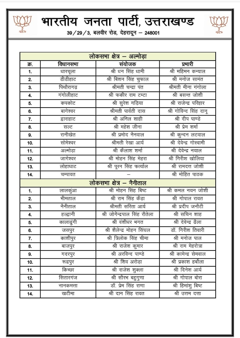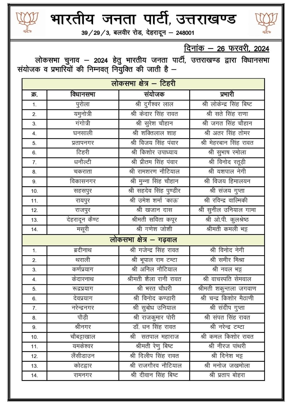 देहरादून। भाजपा ने आगामी लोकसभा चुनाव तैयारियों को आगे बढ़ाते हुए सभी 70 विधानसभा क्षेत्रों में संयोजक और प्रभारी घोषित कर दिये है। प्रदेश मीडिया प्रभारी मनवीर सिंह चौहान ने कहा कि प्रदेश अध्यक्ष के निर्देश पर सभी प्रतिनिधियों की सूची को अंतिम रूप दिया गया है।