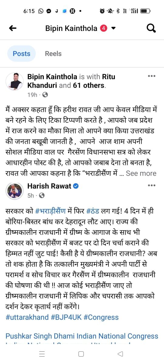 देहरादून-भाजपा प्रदेश प्रवक्ता बिपिन कैंथोला ने कांग्रेस नेता हरीश रावत की सोशल मीडिया पर लिखी टिप्पणी पर हमला करते हुए कहा कि रावत आज केवल खबरों में बने रहने के लिए बेतुकी बातें व तथ्यों से परे की बात करने लगे है , कैंथोला ने रावत की गैरसेंण विधानसभा सत्र को लेकर की गई टिप्पणी पर हरीश रावत को आड़े हाथ लेते हुए कहा कि हरीश रावत की यह पोस्ट आधारहीन पोस्ट है, व इस पोस्ट का एकमात्र उद्देश्य केवल राजनीति में सुर्खियां बटोरना मात्र है, उन्होंने ने कहा कि आज रावत समेत काग्रेस के अधिकांश नेता हल्की बयानबाजी व तथ्यों से परे की बातें करके केवल अपने आप आपको राजनीति में जिंदा रखने के काम पर लगे है , कैंथोला ने कहा कि जबकि ऐसे बिना तथ्यों की बयानबाजी व बिना तथ्यो की बातों के कारण से प्रदेश की छवि धूमिल होती है, परन्तु कांग्रेस के नेता इस प्रकार की बयानबाजी से फिर भी बाज नही आते,और अपने बेतुके बयानों से राज्य की साख खराब करने से भी नहीं चुकते है, कैंथोला ने कहा कि रावत को अपनी सरकार के समय पर किये गए कुकृतों व जनविरोधी नीतियों जिसके कारण उत्तराखंड प्रदेश विकास की राह में काफी पीछे रह गया था, और यह भी रावत को उत्तराखंड की जनता बताना चाहिये कि कॉंग्रेस सरकार के कार्यकाल में व रावत की सरकार के कार्यकाल में भराड़ीसैन में कितनी बार और कितने दिन तक विधानसभा सत्र आयोजित हुए कैंथोला ने कहा कि खुद तो कांग्रेस ने अपने कार्यकाल में दो बार भरडीसैंण में सत्र आयोजित किये जो कि हरीश रावत व काग्रेसी नेता शायद भूल जाते है , और तो और अपने समय पर किये गए जनविरोधी कार्यों को भूल जाते है