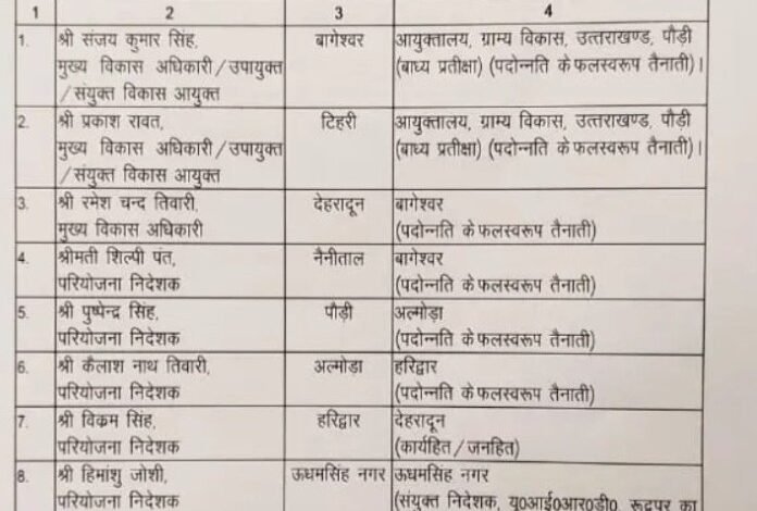 उत्तराखंड में शासन से जुड़ी बड़ी खबर आ रही है। शासन ने ग्राम्य विकास अनुभाग के कई अधिकारियों के तबादले और प्रमोशन किए है। जिसके आदेश जारी किए गए है।