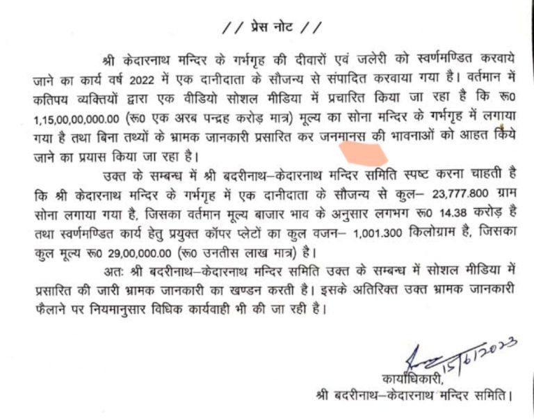 अतः श्री बदरीनाथ-केदारनाथ मन्दिर समिति उक्त के सम्बन्ध में सोशल मीडिया में प्रसारित की जारी भ्रामक जानकारी का खण्डन करती है। इसके अतिरिक्त उक्त भ्रामक जानकारी फैलाने पर नियमानुसार विधिक कार्यवाही भी की जा रही है।