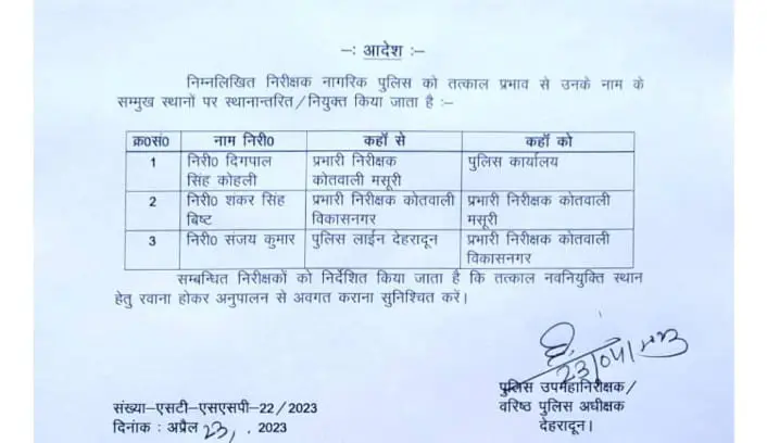 देहरादून में हुए निरीक्षकों के ट्रांसफर, लिस्ट देखें