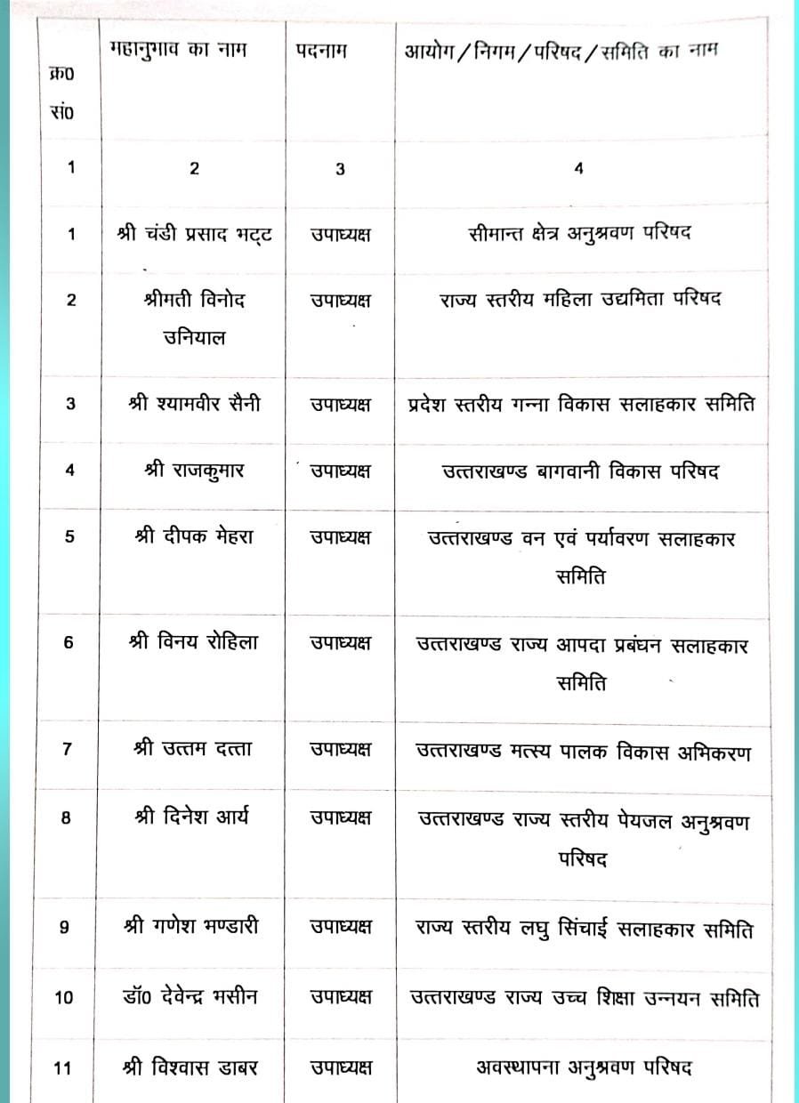 देहरादून :उत्तराखंड से जुड़ी खबर सामने आई है। उत्तराखंड में अगले साल लोकसभा के चुनाव होने वाले है। जिस पर अब बीते कल गुरूवार की रात को धामी सरकार ने दायित्वधारियों की तीसरी सूची जारी कर दी है। सरकार ने दायित्वधारियों की तीसरी सूची जारी कर दी है। गुरुवार देर रात 11 नेताओं को दायित्व सौंप दिए गए हैं।