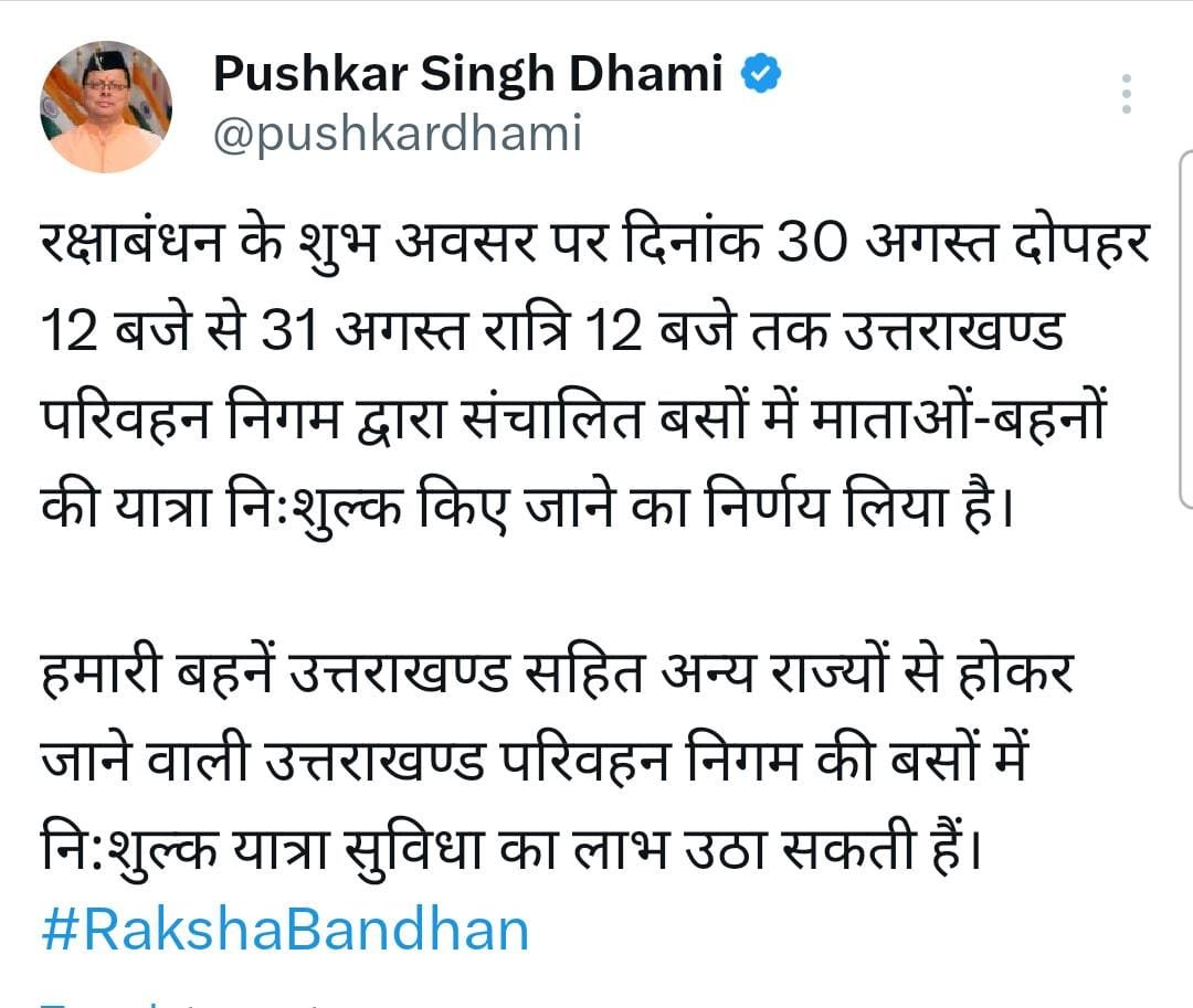 देहरादून : उत्तराखंड के सीएम पुष्कर सिंह धामी ने प्रदेश भर की महिलाओं को फ्री बस सेवा का तोहफा दिया है। मुख्यमंत्री पुष्कर सिंह धामी के निर्देश पर रक्षाबंधन के अवसर पर आगामी 30 अगस्त दोपहर 12 बजे से 31 अगस्त रात्रि 12 बजे तक प्रदेश की महिलाओं को प्रदेश के अंदर उत्तराखण्ड परिवहन निगम द्वारा संचालित बसों के किराए में शत प्रतिशत छूट दी जायेगी।