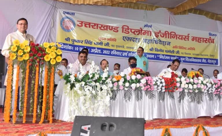 मुख्यमंत्री पुष्कर सिंह धामी ने सोमवार को दून विश्व विद्यालय रोड स्थित निरंजन फार्म में उत्तराखण्ड डिप्लोमा इंजीनियर्स महासंघ के एकादश अधिवेशन में प्रतिभाग किया। उन्होंने कहा कि इस अधिवेशन में मंथन से जो अमृत निकलेगा, वह कार्य के प्रति सभी लोगों को प्रेरणा देगा और नई ऊर्जा का संचार करेगा। डिप्लोमा इंजीनियर्स महासंघ ने विभिन्न बिन्दुओं की जो मांग रखी है, उन मांगों का समाधान करने का हर संभव प्रयास किया जायेगा। मुख्यमंत्री ने कहा कि अपर मुख्य सचिव आनन्द बर्द्धन से वार्ता कर डिप्लोमा इंजीनियर्स महासंघ के पदाधिकारी सभी समस्याओं से अवगत करायें, जिन समस्याओं का जल्द निराकरण हो सकता है, किया जायेगा।