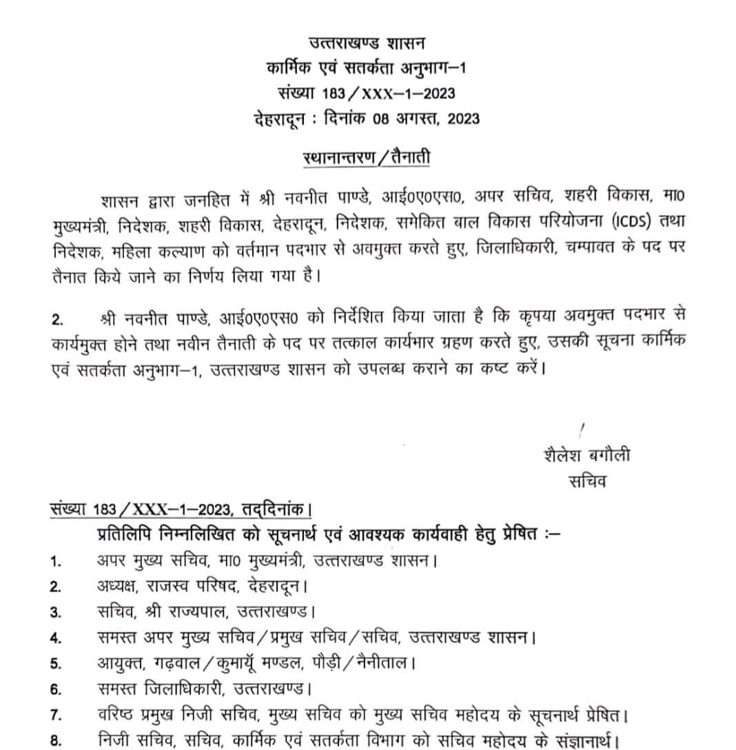 आदेश: जनहित में नवनीत पाण्डे, आई०ए०एस०, अपर सचिव शहरी विकास, मा० मुख्यमंत्री, निदेशक, शहरी विकास, देहरादून, निदेशक, समेकित बाल विकास परियोजना (ICDS) तथा निदेशक, महिला कल्याण को वर्तमान पदभार से अवमुक्त करते हुए, जिलाधिकारी, चम्पावत के पद पर तैनात किये जाने का निर्णय लिया गया है।