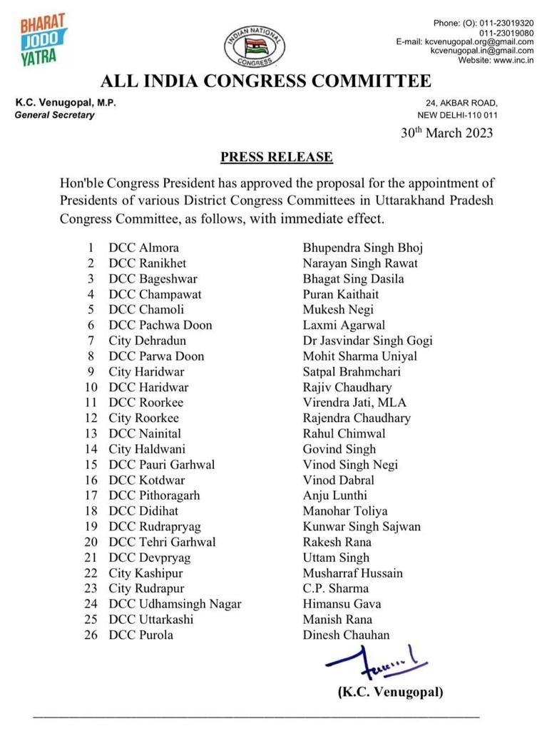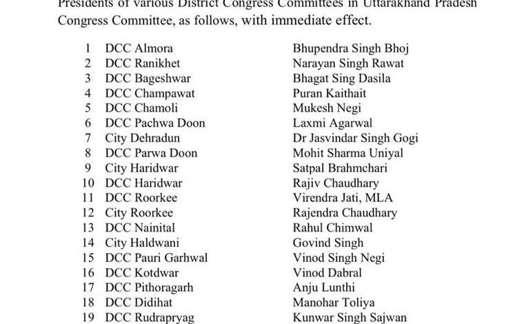 उत्तराखंड कांग्रेस प्रदेश अध्यक्ष ने प्रदेश कांग्रेस कमेटी में विभिन्न जिला कांग्रेस कमेटी के अध्यक्षों की घोषणा की गई है। जो कि नीचे निम्नलिखित रूप से है :-